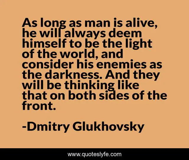 This page presents the quote "As long as man is alive, he will always deem himself to be the light of the world, and consider his enemies as the darkness. And they will be thinking like that on both sides of the front.". Author of this quote is Dmitry Glukhovsky. This quote is about war, man,.