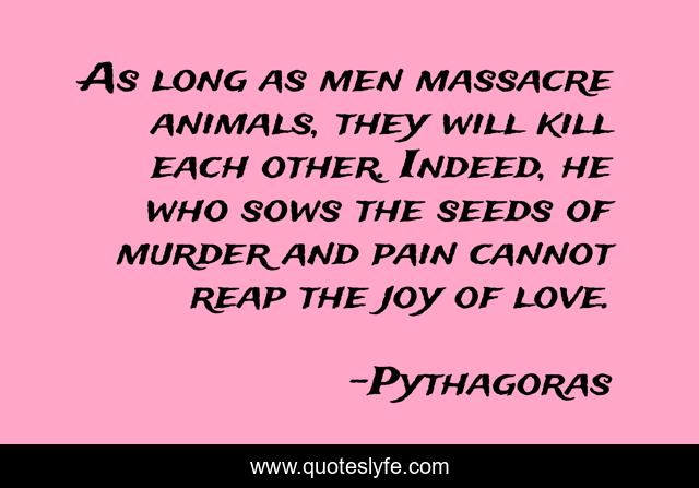 This page presents the quote "As long as men massacre animals, they will kill each other. Indeed, he who sows the seeds of murder and pain cannot reap the joy of love.". Author of this quote is Pythagoras. This quote is about caring-for-others, massacre, thought-provoking,.