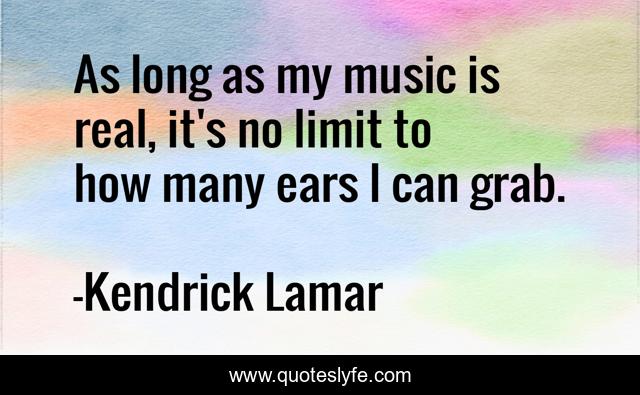 This page presents the quote "As long as my music is real, it's no limit to how many ears I can grab.". Author of this quote is Kendrick Lamar. This quote is about limit, long, i can,.