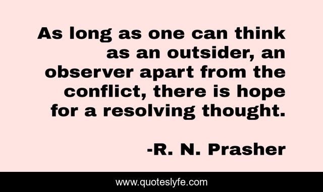 This page presents the quote "As long as one can think as an outsider, an observer apart from the conflict, there is hope for a resolving thought.". Author of this quote is R. N. Prasher. This quote is about resolve, observere, hope, alternative, detached, conflict,.