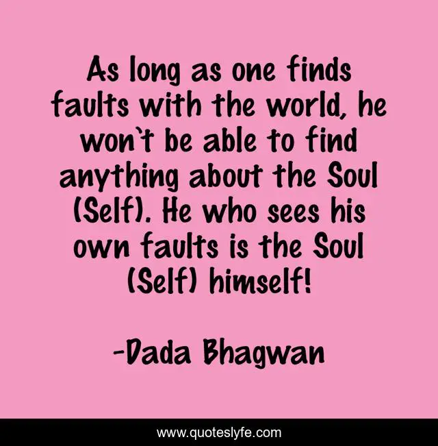 This page presents the quote "As long as one finds faults with the world, he won’t be able to find anything about the Soul (Self). He who sees his own faults is the Soul (Self) himself!". Author of this quote is Dada Bhagwan. This quote is about spiritual, faults, fault, self, soul, knowledge-of-the-self, knowledge-of-self, self-realization, self-realisation,.