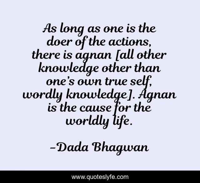 This page presents the quote "As long as one is the doer of the actions, there is agnan [all other knowledge other than one’s own true self, wordly knowledge]. Agnan is the cause for the worldly life.". Author of this quote is Dada Bhagwan. This quote is about world, gnan, life, spiritual, knowledge,.