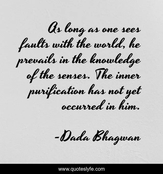 This page presents the quote "As long as one sees faults with the world, he prevails in the knowledge of the senses. The inner purification has not yet occurred in him.". Author of this quote is Dada Bhagwan. This quote is about spiritual, knowledge, faults, fault, knowledge-of-the-self, knowledge-of-self, self-realization, self-realisation, inner-purificaiton,.