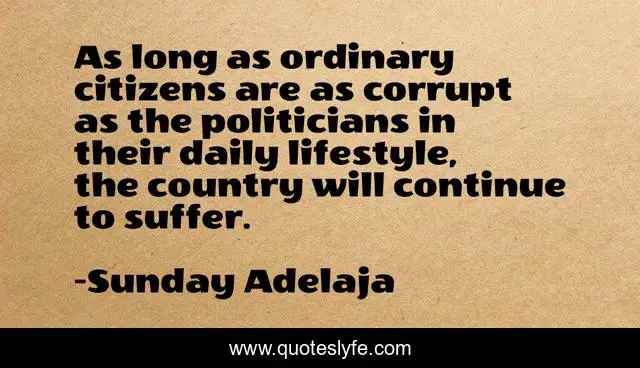 This page presents the quote "As long as ordinary citizens are as corrupt as the politicians in their daily lifestyle, the country will continue to suffer.". Author of this quote is Sunday Adelaja. This quote is about politicians, lifestyle, citizen,.