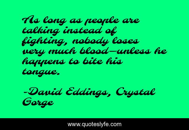 This page presents the quote "As long as people are talking instead of fighting, nobody loses very much blood—unless he happens to bite his tongue.". Author of this quote is David Eddings, Crystal Gorge. This quote is about negotiation, blood, talk, fight,.