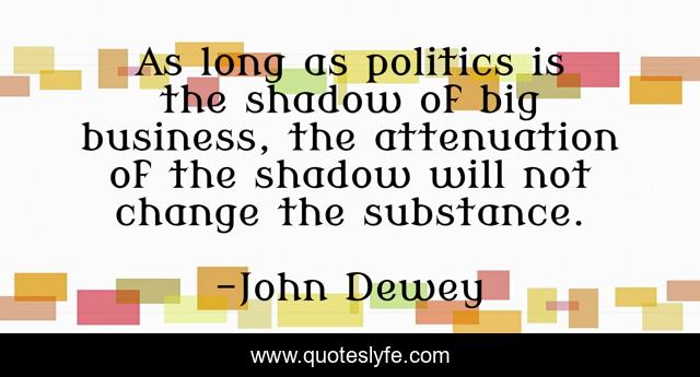 This page presents the quote "As long as politics is the shadow of big business, the attenuation of the shadow will not change the substance.". Author of this quote is John Dewey. This quote is about big-business, attenuation, business, substance, politics, shadow, corruption,.