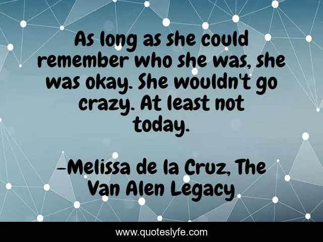 This page presents the quote "As long as she could remember who she was, she was okay. She wouldn't go crazy. At least not today.". Author of this quote is Melissa de la Cruz, The Van Alen Legacy. This quote is about sanity, bliss-llewellyn, the-van-alen-legacy, insanity,.