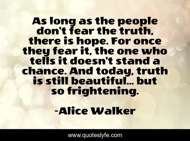 This page presents the quote "As long as the people don't fear the truth, there is hope. For once they fear it, the one who tells it doesn't stand a chance. And today, truth is still beautiful... but so frightening.". Author of this quote is Alice Walker. This quote is about beautiful, fear, hope,.