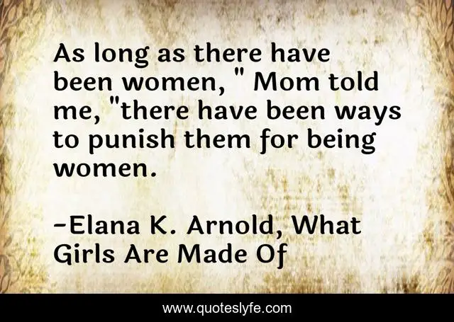 This page presents the quote "As long as there have been women, " Mom told me, "there have been ways to punish them for being women.". Author of this quote is Elana K. Arnold, What Girls Are Made Of. .