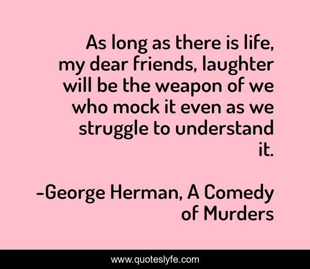 This page presents the quote "As long as there is life, my dear friends, laughter will be the weapon of we who mock it even as we struggle to understand it.". Author of this quote is George Herman, A Comedy of Murders. This quote is about commedia-dell-arte, satire,.