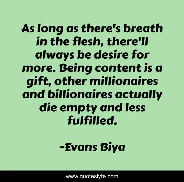 This page presents the quote "As long as there's breath in the flesh, there'll always be desire for more. Being content is a gift, other millionaires and billionaires actually die empty and less fulfilled.". Author of this quote is Evans Biya. .