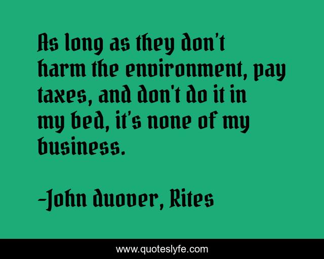 This page presents the quote "As long as they don’t harm the environment, pay taxes, and don't do it in my bed, it’s none of my business.". Author of this quote is John duover, Rites. This quote is about behaviour, enthusiasm, attitude, inspirational, mindset,.