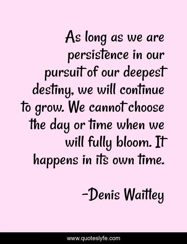This page presents the quote "As long as we are persistence in our pursuit of our deepest destiny, we will continue to grow. We cannot choose the day or time when we will fully bloom. It happens in its own time.". Author of this quote is Denis Waitley. This quote is about future, day, persistence,.