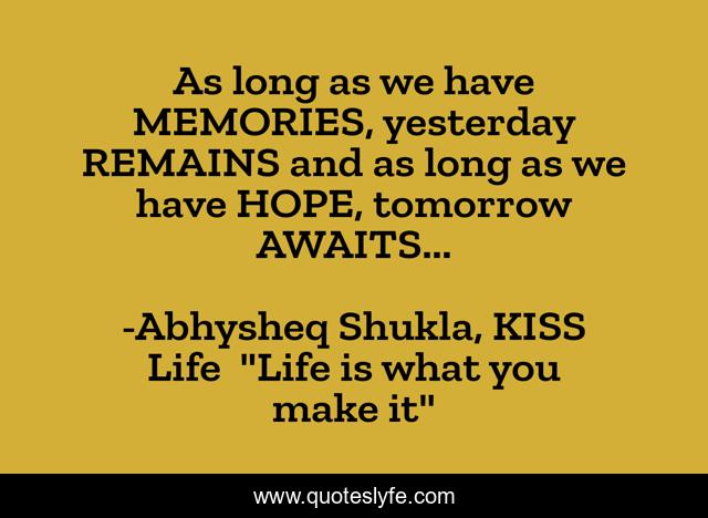 "Abhysheq Shukla, KISS Life "Life is what you make it" Quotes." Quoteslyfe.com, 2025. Mon. 08 Dec. 2025. <https://www.quoteslyfe.com/quote/As-long-as-we-have-MEMORIES-yesterday-81699>.