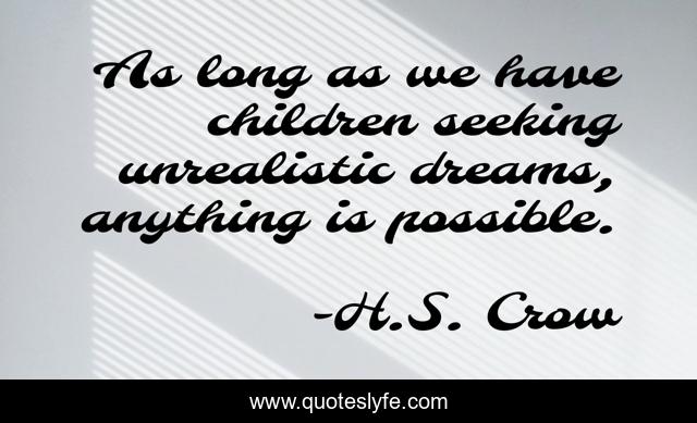 This page presents the quote "As long as we have children seeking unrealistic dreams, anything is possible.". Author of this quote is H.S. Crow. This quote is about dreams, inspirational, ambition, enthusiasm, children, hope,.