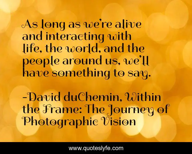 This page presents the quote "As long as we’re alive and interacting with life, the world, and the people around us, we’ll have something to say.". Author of this quote is David duChemin, Within the Frame: The Journey of Photographic Vision. .