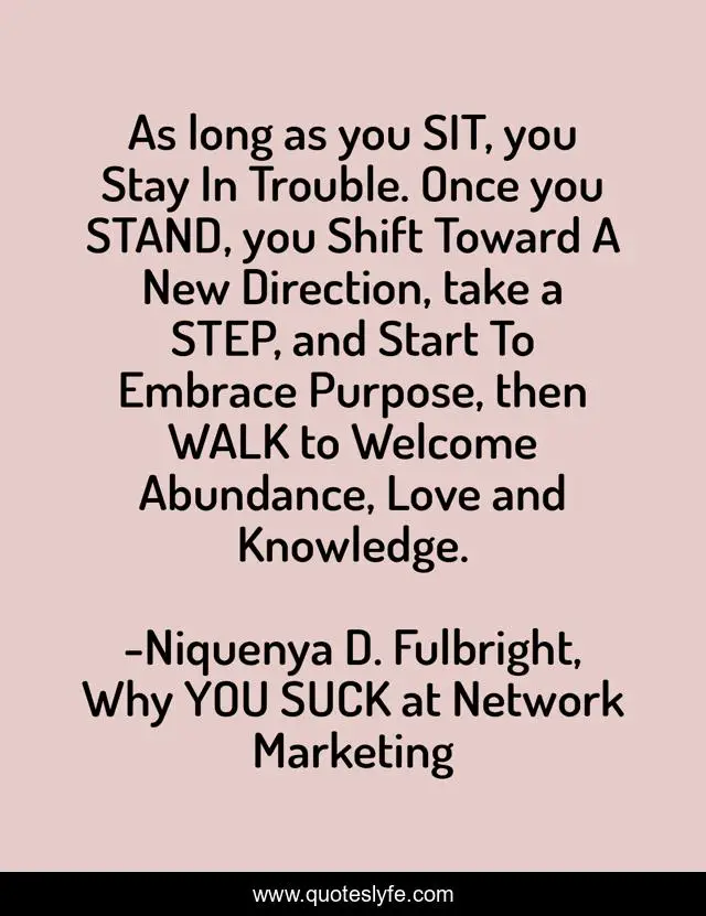 This page presents the quote "As long as you SIT, you Stay In Trouble. Once you STAND, you Shift Toward A New Direction, take a STEP, and Start To Embrace Purpose, then WALK to Welcome Abundance, Love and Knowledge.". Author of this quote is Niquenya D. Fulbright, Why YOU SUCK at Network Marketing. This quote is about confidence, positive, motivational, optimistic, inspirational, self-help, life-philosophy, enthusiasm,.
