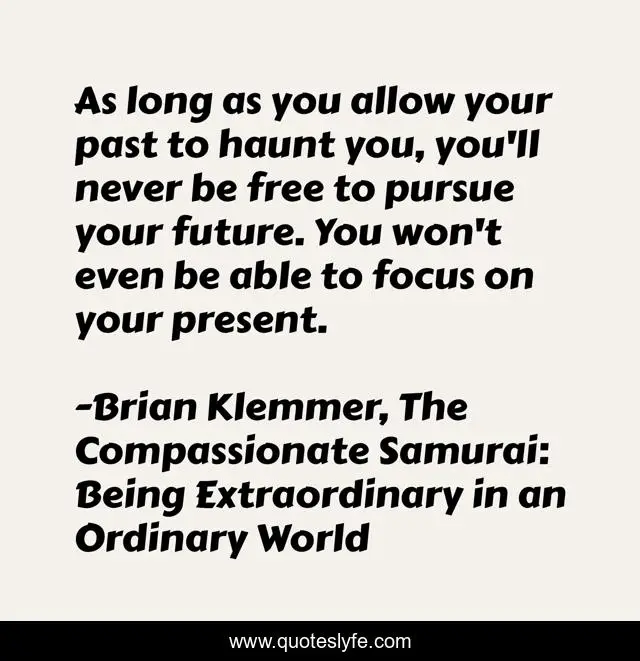 This page presents the quote "As long as you allow your past to haunt you, you'll never be free to pursue your future. You won't even be able to focus on your present.". Author of this quote is Brian Klemmer, The Compassionate Samurai: Being Extraordinary in an Ordinary World. .