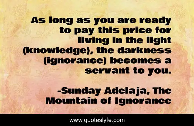 This page presents the quote "As long as you are ready to pay this price for living in the light (knowledge), the darkness (ignorance) becomes a servant to you.". Author of this quote is Sunday Adelaja, The Mountain of Ignorance. This quote is about living, life, darkness, power, danger, servant, god, price, living-well,.