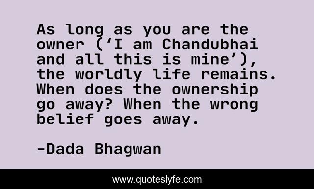 This page presents the quote "As long as you are the owner (‘I am Chandubhai and all this is mine’), the worldly life remains. When does the ownership go away? When the wrong belief goes away.". Author of this quote is Dada Bhagwan. This quote is about world, spiritual, belief,.