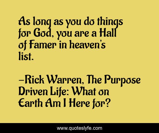 This page presents the quote "As long as you do things for God, you are a Hall of Famer in heaven's list.". Author of this quote is Rick Warren, The Purpose Driven Life: What on Earth Am I Here for?. This quote is about enthusiasm, christian-living, inspirational,.
