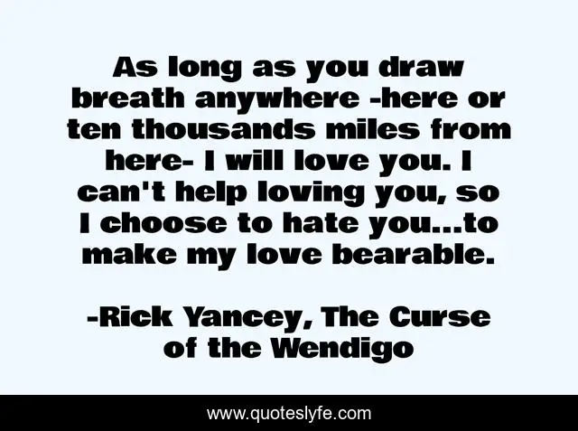 This page presents the quote "As long as you draw breath anywhere -here or ten thousands miles from here- I will love you. I can't help loving you, so I choose to hate you...to make my love bearable.". Author of this quote is Rick Yancey, The Curse of the Wendigo. This quote is about hate, love, affection,.