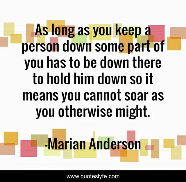 This page presents the quote "As long as you keep a person down some part of you has to be down there to hold him down so it means you cannot soar as you otherwise might.". Author of this quote is Marian Anderson. This quote is about helping, people,.