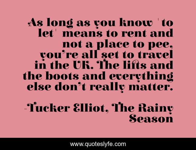 This page presents the quote "As long as you know 'to let' means to rent and not a place to pee, you’re all set to travel in the UK. The lifts and the boots and everything else don’t really matter.". Author of this quote is Tucker Elliot, The Rainy Season. This quote is about united-kingdom, england, students, travel, teaching, military, education, 9-11,.