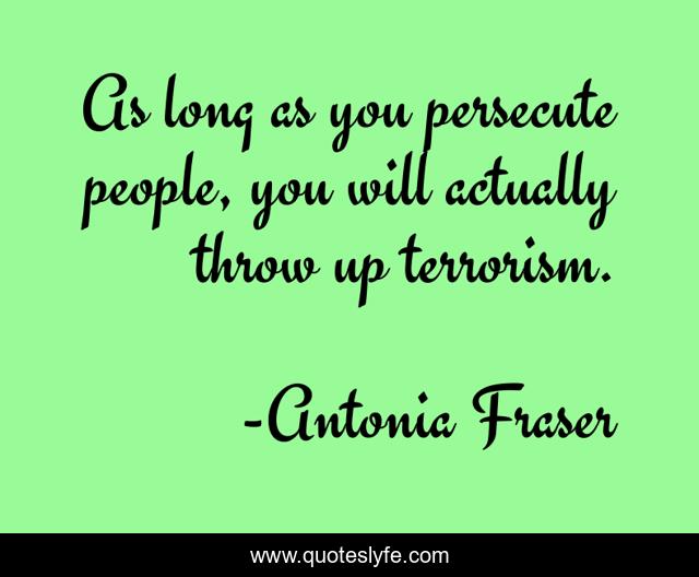 This page presents the quote "As long as you persecute people, you will actually throw up terrorism.". Author of this quote is Antonia Fraser. This quote is about persecution, hatred, violence, oppression, terrorism,.