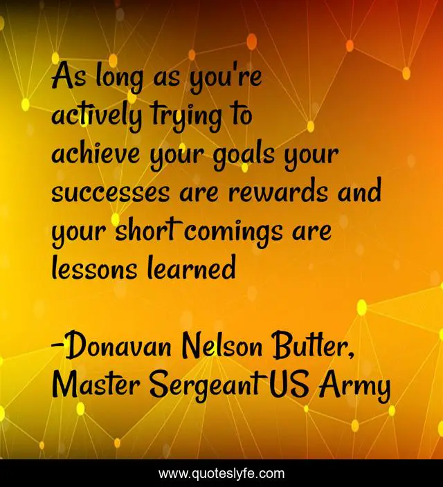 This page presents the quote "As long as you're actively trying to achieve your goals your successes are rewards and your short comings are lessons learned". Author of this quote is Donavan Nelson Butler, Master Sergeant US Army. This quote is about military, leadership, selfless-service-contentment,.