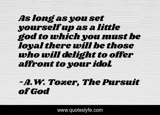 This page presents the quote "As long as you set yourself up as a little god to which you must be loyal there will be those who will delight to offer affront to your idol.". Author of this quote is A.W. Tozer, The Pursuit of God. .