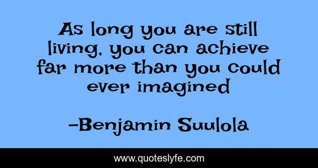 This page presents the quote "As long you are still living, you can achieve far more than you could ever imagined". Author of this quote is Benjamin Suulola. This quote is about faith, destiny, inspirational, writing-inspiration, courage, leadership, enthusiasm,.