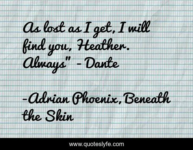 This page presents the quote "As lost as I get, I will find you, Heather. Always" - Dante". Author of this quote is Adrian Phoenix, Beneath the Skin. This quote is about urban-fantasy, devotion,.