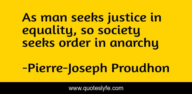 This page presents the quote "As man seeks justice in equality, so society seeks order in anarchy". Author of this quote is Pierre-Joseph Proudhon. This quote is about justice, anarchism, equality,.