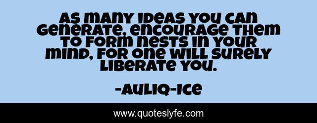 This page presents the quote "As many ideas you can generate, encourage them to form nests in your mind, for one will surely liberate you.". Author of this quote is Auliq-Ice. This quote is about goals-in-life, life-goals, creativity, wisdom, reason, planning, goal-setting, strategic-planning, reasoning,.
