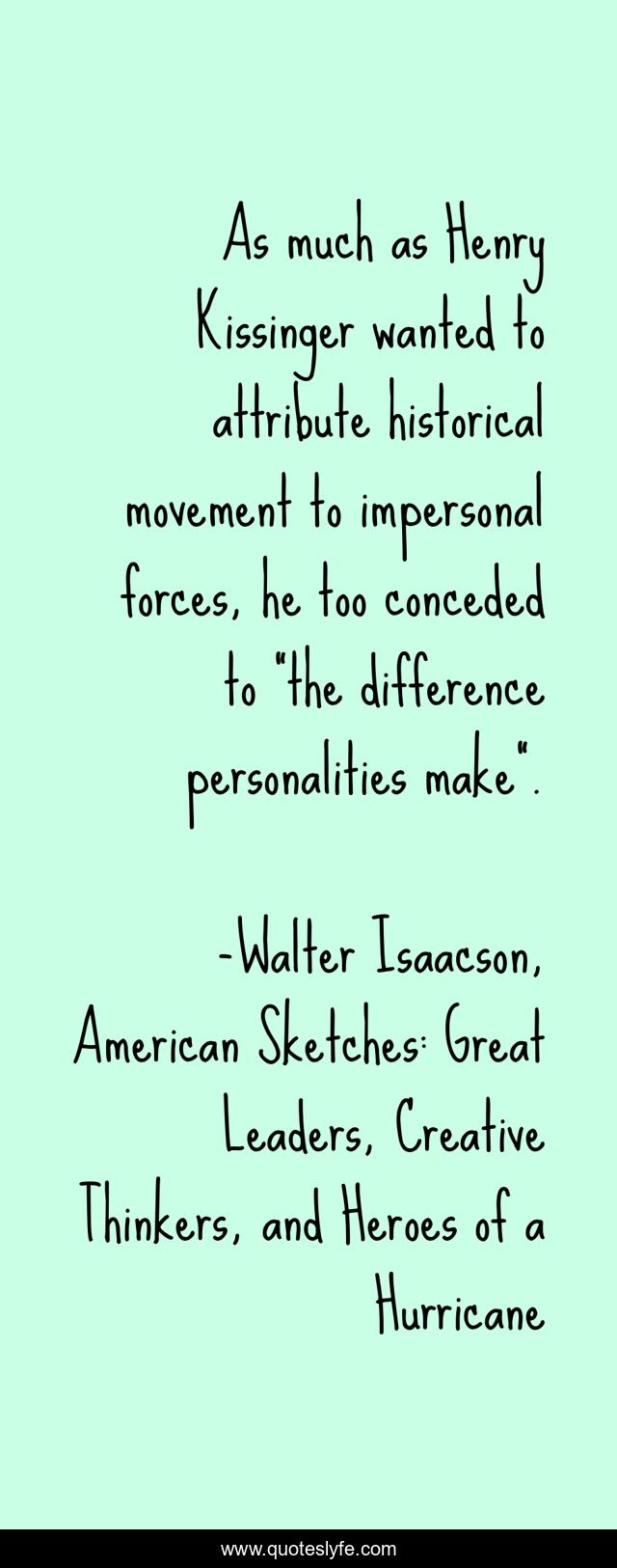 This page presents the quote "As much as Henry Kissinger wanted to attribute historical movement to impersonal forces, he too conceded to "the difference personalities make".". Author of this quote is Walter Isaacson, American Sketches: Great Leaders, Creative Thinkers, and Heroes of a Hurricane. This quote is about discipleship, leadership, inspiration,.
