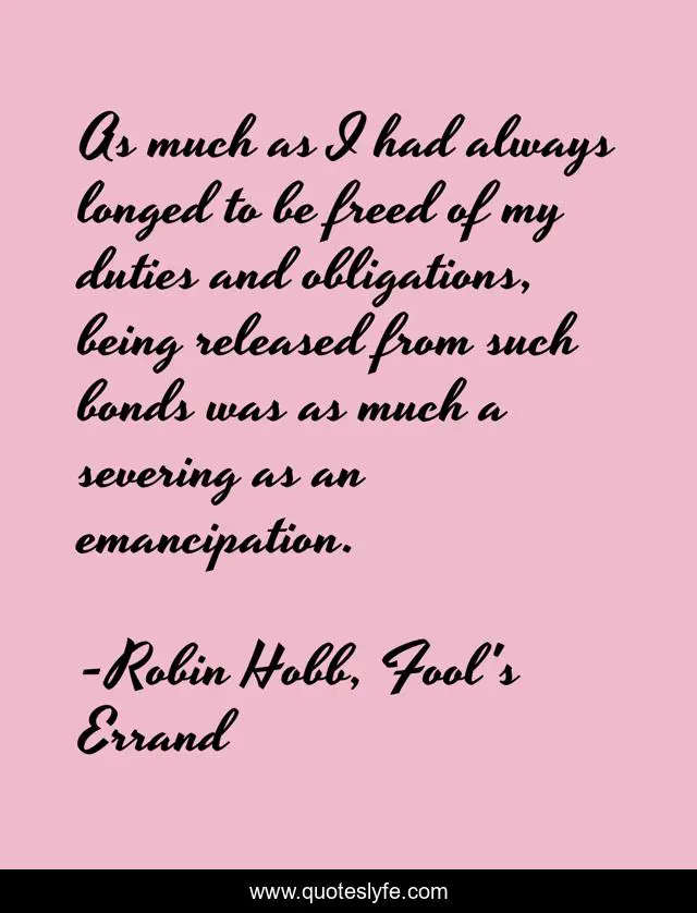 This page presents the quote "As much as I had always longed to be freed of my duties and obligations, being released from such bonds was as much a severing as an emancipation.". Author of this quote is Robin Hobb, Fool's Errand. This quote is about duty, end, bonds, freedom, reality, emancipation, responsibilities, responsibility, duties,.