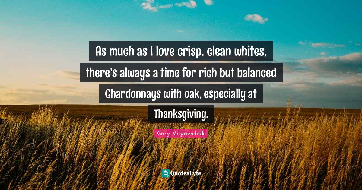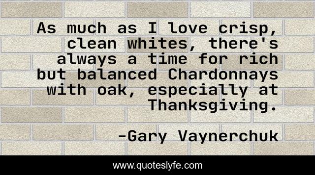 This page presents the quote "As much as I love crisp, clean whites, there's always a time for rich but balanced Chardonnays with oak, especially at Thanksgiving.". Author of this quote is Gary Vaynerchuk. This quote is about love, rich, affection, time,.