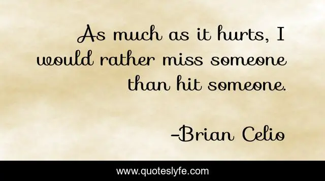 This page presents the quote "As much as it hurts, I would rather miss someone than hit someone.". Author of this quote is Brian Celio. This quote is about hurt, peace, quip, violence,.
