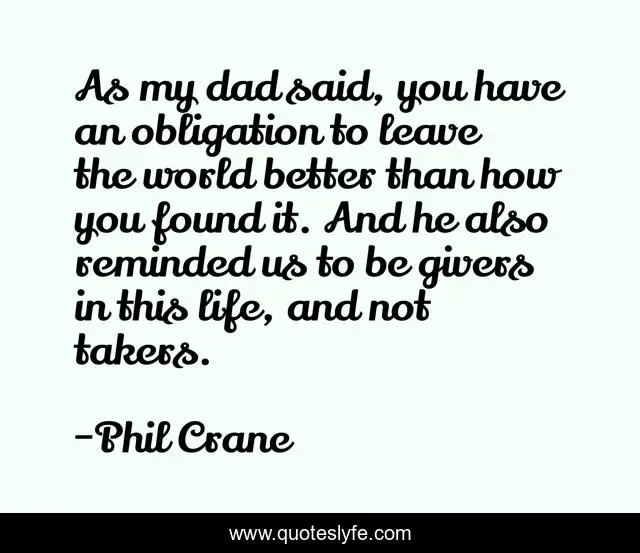 This page presents the quote "As my dad said, you have an obligation to leave the world better than how you found it. And he also reminded us to be givers in this life, and not takers.". Author of this quote is Phil Crane. This quote is about better, world, life,.