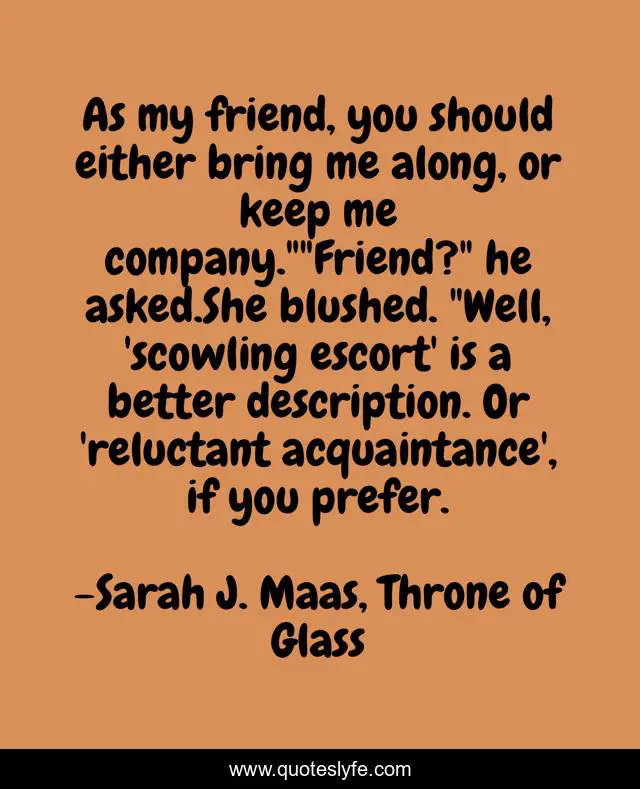 This page presents the quote "As my friend, you should either bring me along, or keep me company.""Friend?" he asked.She blushed. "Well, 'scowling escort' is a better description. Or 'reluctant acquaintance', if you prefer.". Author of this quote is Sarah J. Maas, Throne of Glass. .