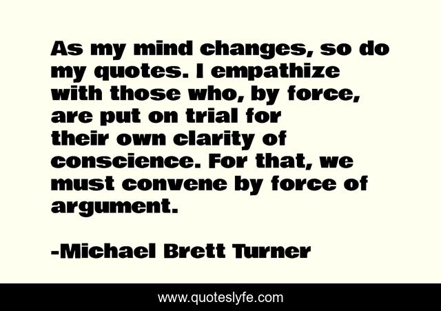 This page presents the quote "As my mind changes, so do my quotes. I empathize with those who, by force, are put on trial for their own clarity of conscience. For that, we must convene by force of argument.". Author of this quote is Michael Brett Turner. .
