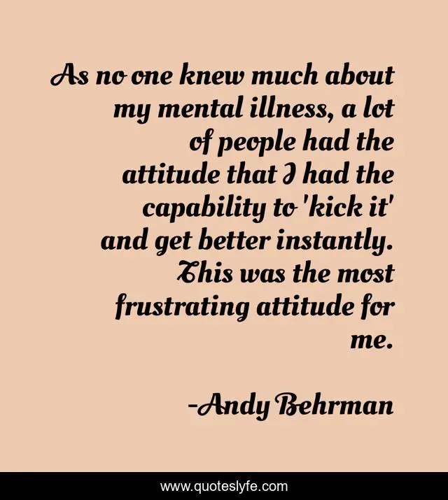 This page presents the quote "As no one knew much about my mental illness, a lot of people had the attitude that I had the capability to 'kick it' and get better instantly. This was the most frustrating attitude for me.". Author of this quote is Andy Behrman. This quote is about me, mental illness, people,.