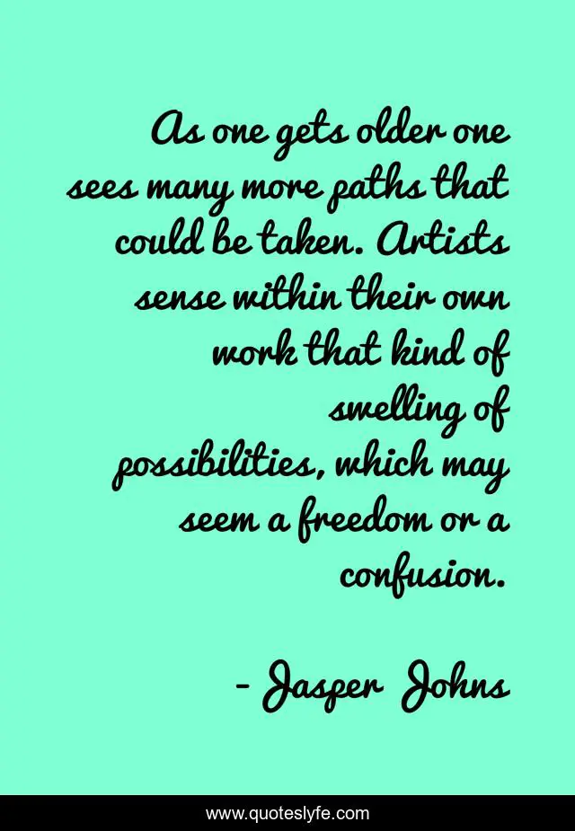 This page presents the quote "As one gets older one sees many more paths that could be taken. Artists sense within their own work that kind of swelling of possibilities, which may seem a freedom or a confusion.". Author of this quote is Jasper Johns. This quote is about paths, kind, work,.