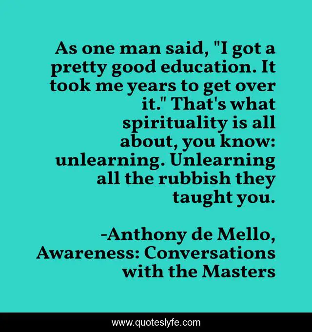 This page presents the quote "As one man said, "I got a pretty good education. It took me years to get over it." That's what spirituality is all about, you know: unlearning. Unlearning all the rubbish they taught you.". Author of this quote is Anthony de Mello, Awareness: Conversations with the Masters. This quote is about spirituality, awareness,.