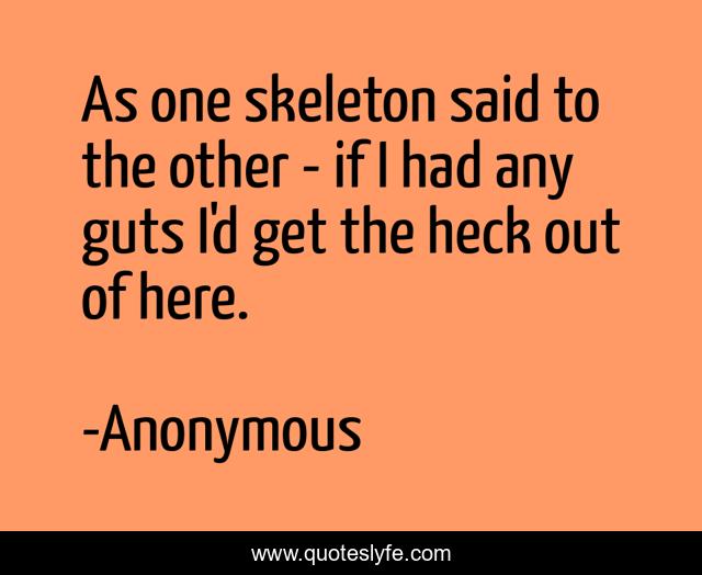 This page presents the quote "As one skeleton said to the other - if I had any guts I'd get the heck out of here.". Author of this quote is Anonymous. This quote is about introductions, openers,.