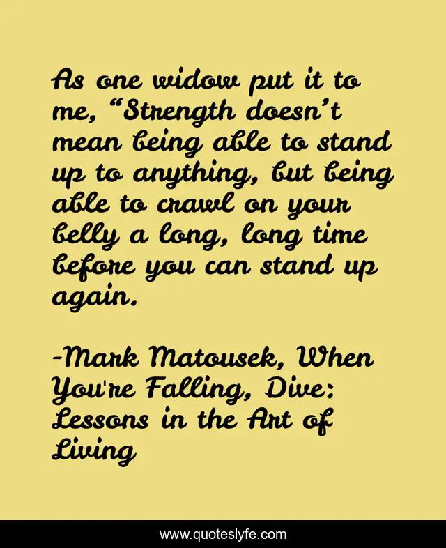 This page presents the quote "As one widow put it to me, “Strength doesn’t mean being able to stand up to anything, but being able to crawl on your belly a long, long time before you can stand up again.". Author of this quote is Mark Matousek, When You're Falling, Dive: Lessons in the Art of Living. .