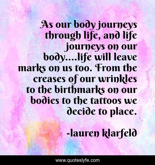 This page presents the quote "As our body journeys through life, and life journeys on our body….life will leave marks on us too. From the creases of our wrinkles to the birthmarks on our bodies to the tattoos we decide to place.". Author of this quote is lauren klarfeld. This quote is about body, aging, body-image, tattoos, life, journey, body-and-mind, aging-gracefully,.