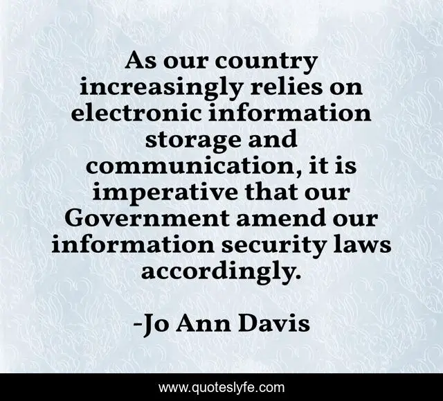 This page presents the quote "As our country increasingly relies on electronic information storage and communication, it is imperative that our Government amend our information security laws accordingly.". Author of this quote is Jo Ann Davis. This quote is about information, government,.