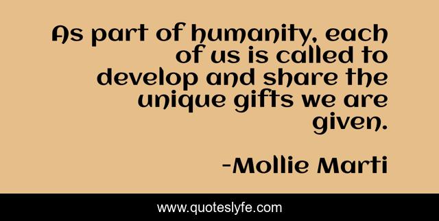 This page presents the quote "As part of humanity, each of us is called to develop and share the unique gifts we are given.". Author of this quote is Mollie Marti. This quote is about strength, community, life-design, mentorship,.